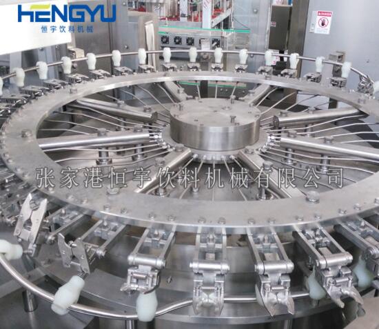 沖洗干凈的瓶子通過撥瓶星輪由沖瓶部導(dǎo)出至灌裝部.進(jìn)入灌裝部的瓶子由瓶頸叉叉住,通過升降機(jī)構(gòu)在凸輪的作用下實(shí)現(xiàn)上升,保持及下降.在運(yùn)行過程中瓶子頂開灌裝閥,通過封閉式灌裝方式進(jìn)行灌裝.產(chǎn)量的調(diào)節(jié)由PLC控制變頻器進(jìn)行速度控制.采用高速灌裝閥,液位控制精確。