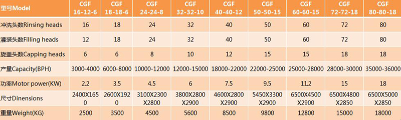 CGF系列PET瓶沖洗、灌裝、封蓋三合一機(jī),吸取了優(yōu)良的技術(shù),性能穩(wěn)定,安全可靠。