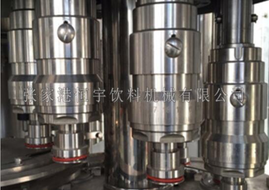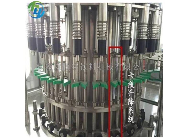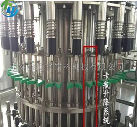 沖洗干凈的瓶子通過撥瓶星輪由沖瓶部導(dǎo)出至灌裝部.進(jìn)入灌裝部的瓶子由瓶頸叉叉住,通過升降機(jī)構(gòu)在凸輪的作用下實現(xiàn)上升,保持及下降.在運(yùn)行過程中瓶子頂開灌裝閥,通過封閉式灌裝方式進(jìn)行灌裝.產(chǎn)量的調(diào)節(jié)由PLC控制變頻器進(jìn)行速度控制.采用高速灌裝閥,液位控制精確。